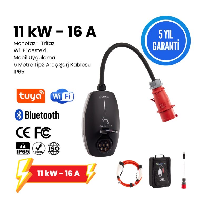EVcharge 11 kW – 16 A Elektrikli Araç Şarj Cihazı, TYPE 2, 5 MT Kablolu, Monofaz, Trifaz, IP65, Wi-Fi, Türkçe Mobil Uygulama