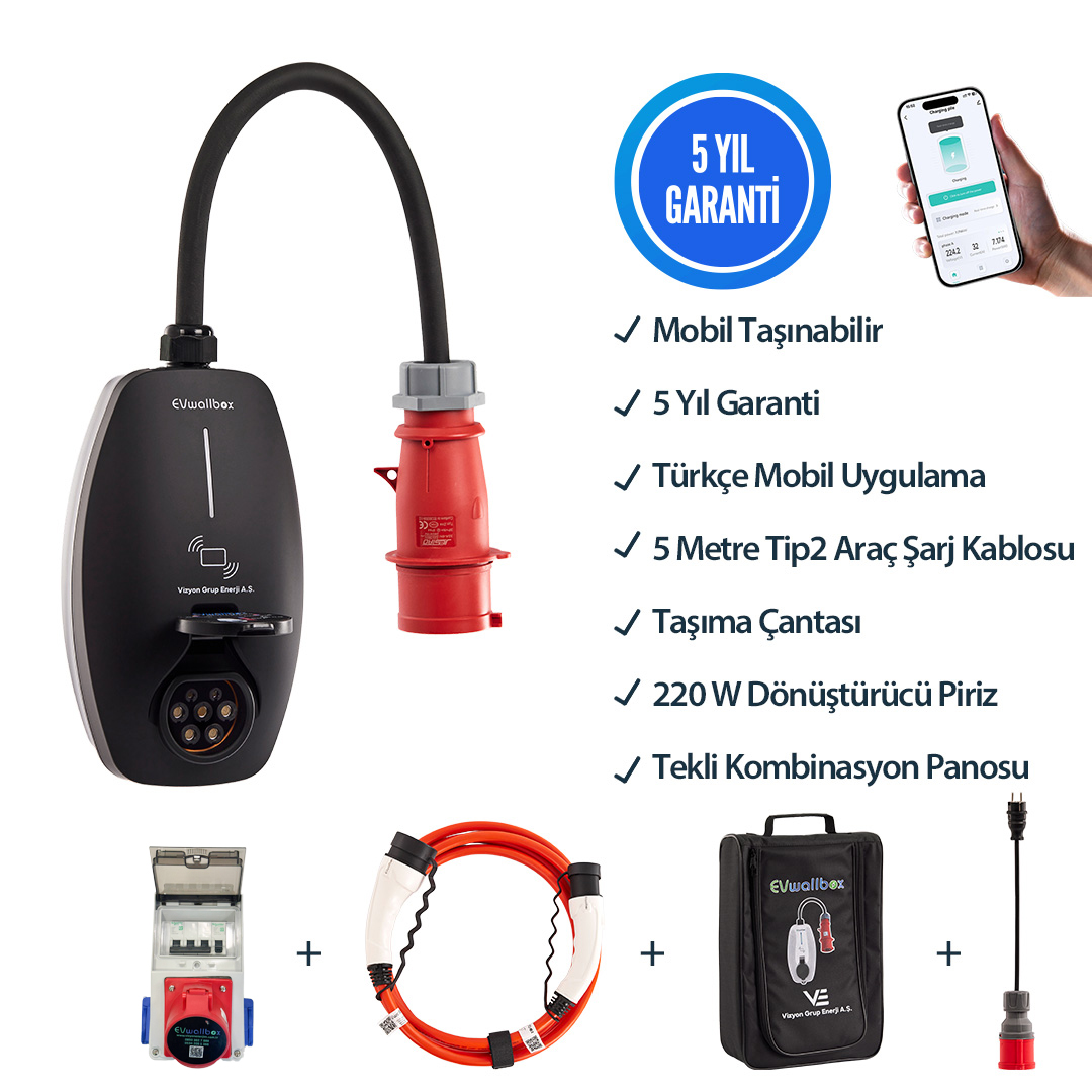 EVwallbox 22KW V3 Türkçe Mobil Uygulama 5 Yıl Garanti, (Tekli Kombinasyon Panosu, 5 MT Tip2 Araç Şarj Kablosu,Taşıma Çantası ve 220V Dönüştürücü Adaptör)